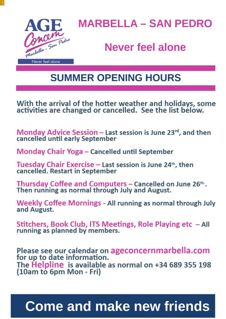 We wish you all a Very Safe Summer. Remember our coffee mornings and our Helpline is open throughout the summer